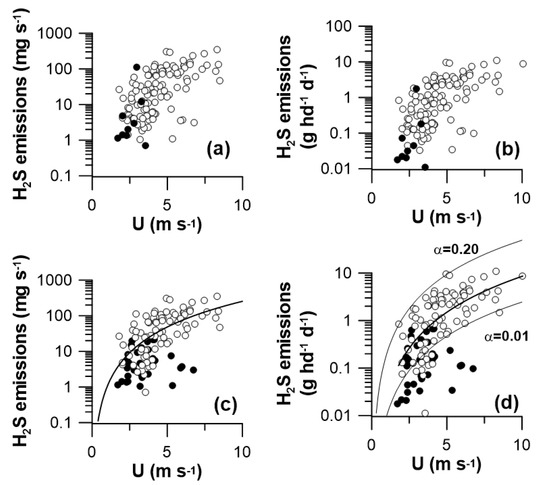 Dependence of daily H2S emissions (representative days) on wind speed. The daily mean emissions for the NC (filled circle) and OK (open circle) are indicated relative to farm lagoon (a) and farm head of animals loading the lagoon (b). The daily mean animal-based emissions for the lagoon with evident PSB (filled circle) and not evident PSB (open circle) are indicated relative to farm lagoon (c) and farm head of animals loading the lagoon (d). The power function regressions of emissions on wind speed (Equation (1)) are indicated by solid line with the upper and lower bound of the power function for the non-PSB lagoon emissions indicated by the thin lines respectively.