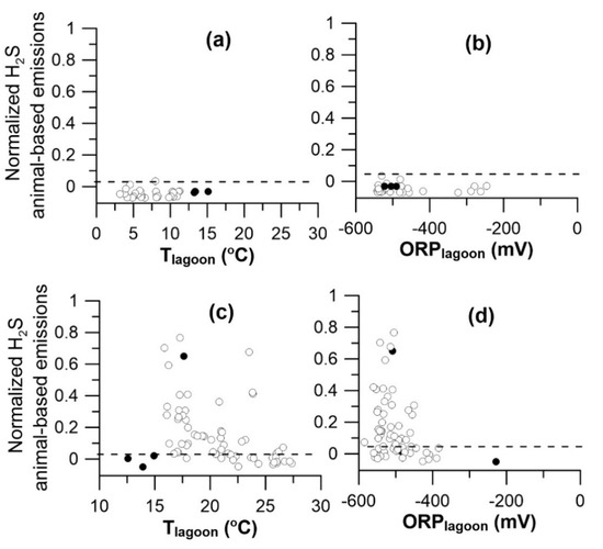 Normalized daily emissions for representative days without evident PSB relative to oxidation-reduction potential. The normalized animal-based daily mean values (Equation (2)) for the NC (solid circle) and OK (open circle) relative to lagoon temperature with evident PSB populations (a) and without evident PSB populations (c). The normalized animal-based daily mean values relative to lagoon ORP with evident PSB populations (b) and without evident PSB populations (d).