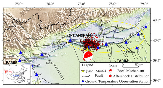 In 2019, the Institute of Geology of the China Earthquake Administration and the Xinjiang Earthquake Administration jointly constructed multiple ground temperature observation stations along the Keping fault in the western section of the South Tianshan Mountains. There are three ground temperature observation stations within 50 km of the epicenter of the Jiashi earthquake: Gedaliang (GDL), Jiashizongchang (JSZC), and Xikeer (XKE). The nearest ground temperature observation station is XKE, which is about 1.4 km away. According to the seismic rupture area inverted by Li et al. [28], from the interferometric synthetic aperture radar (InSAR) deformation field, the XKE ground temperature observation station happens to be within the area (Figure 1).