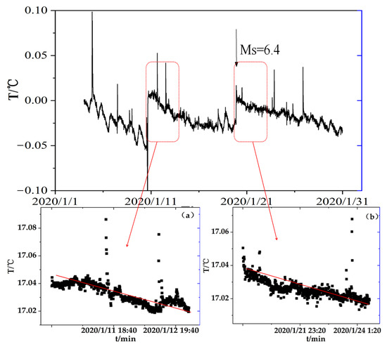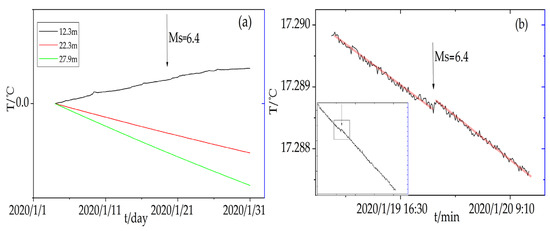 At the time of the earthquake, the coseismic temperature changes were detected at depths of 12.3, 22.8, and 33.38 m in this observation station (Figure 2). The initial value has been subtracted from the data. The ground temperature changes at 12.3 and 22.8 m were relatively stable, and the coseismic geothermal changes were relatively small, about ΔT = 0.0001 °C (Figure 3a,b). A significant coseismic change was observed at the 33.38 m layer (Figure 2), and the temperature step increased to ΔT = 0.0432 °C. It is worth noting that the ground temperature of this layer was observed to have obvious diurnal changes. Previous studies have found that when the layer contains fluid related to the change of surface temperature, the ground temperature of the layer will show diurnal change [29]. So fluid infiltration may cause the temperature changes. This layer showed a rapid temperature rise on 10 January 2020, with an amplitude of ΔT = 0.056 °C, which was the artificial noise.