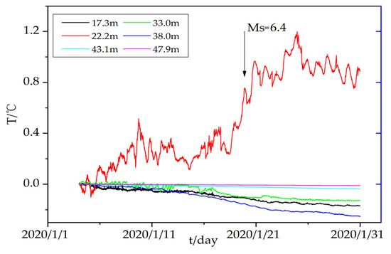 The temperature changes on 33 m are similar in amplitude similar to fluctuations before and after the earthquake. The only significant feature is the gradual increase of temperature a couple of days before the earthquakes. We also noted that clear diurnal variation can be observed in this layer. The lithology of this layer is dominated by sandstone. It is speculated that the change may be caused by fractures in the rock mass and fluid infiltration into the fissures [31,32]. Generally, the temperature of the rock in the deeper layer is not affected easily by a surface temperature change.