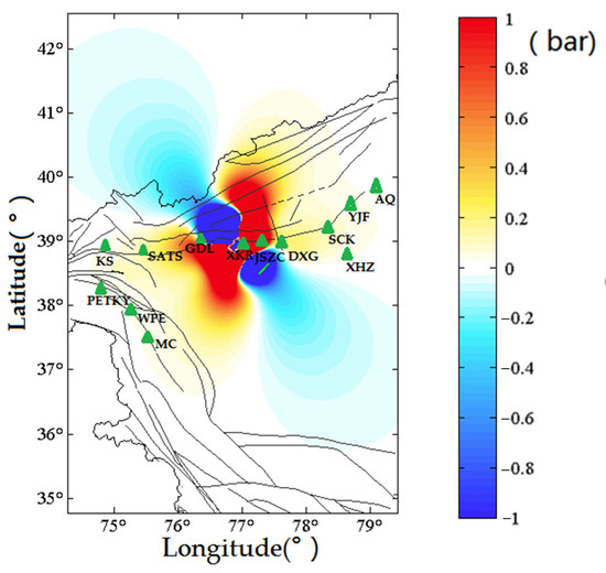 The coseismic Coulomb stress field of the Ms = 6.4 Jiashi earthquake by using the Coulomb 3.3. The software was downloaded from https://pubs.usgs.gov/of/2011/1060/ (accessed on 3 January 2016).