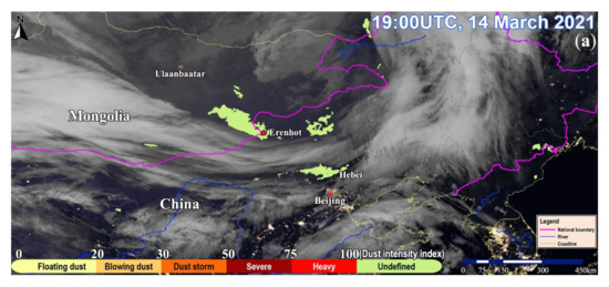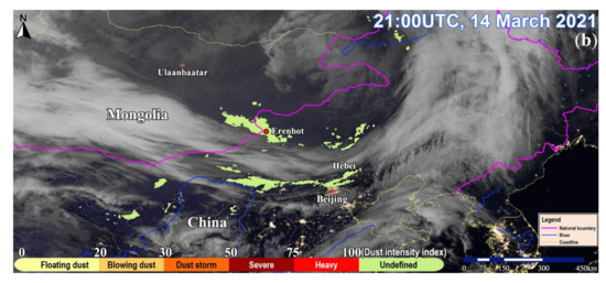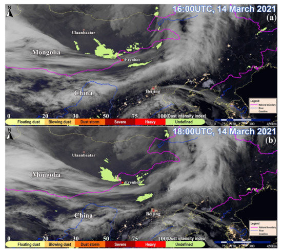 Dust air mass arrived in surrounding area of Beijing and formed dense floating dust. (a) and (b) correspond to the scenes at 19:00 and 21:00 (UTC) on 14 March 2021.