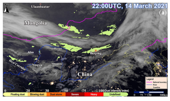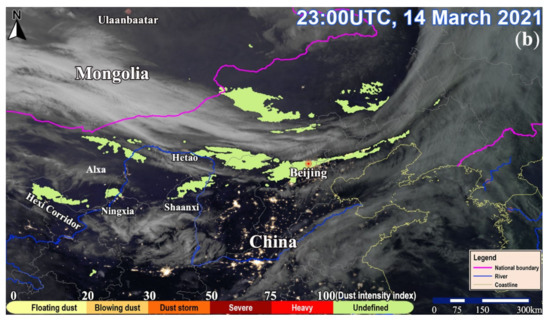 Dust emission and floating dust weather occurred in Hexi Corridor and moved eastward. (a) and (b) correspond to the scenes at 22:00 and 23:00 (UTC) on 14 March 2021.