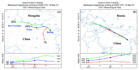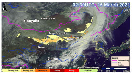 Sand and dust storms are severe environmental issues and air pollution events occurring in arid and semi-arid regions of the world [1,2]. In northeast Asia, deserts and sandy lands distributed in Mongolia and northwest China are the main sources of dust storms impacting the densely populated areas in China, Korea and Japan [3]. The dust storm occurred in northern China during 14–16 March 2021 (the “3.15” dust storm hereafter) significantly affected the air quality of north China and caused serious casualties and property losses in Mongolia. The great intensity, wide range of influence and long duration features of this dust storm are rare in the past decade, enabling it to become “the most serious dust storm in the past decade” and arousing widespread concern in the whole society. In Liang’s paper, the authors analyzed the transport process of the mega dust storm by comprehensively analyzing various types of satellite remote sensing data and ground-based observations, combining with HYSPLIT backward trajectory tracking analysis technique [1]. In another research project, Filonchyk investigated the synoptic conditions using the ERA5 data from the European Center for Medium Range Weather Forecasts (ECMWF), and the research revealed the influence scope and distribution characteristics of particulate matter using combined data from ground-based observation network and satellite remote sensing data of the “3.15” dust storm [2].