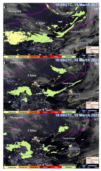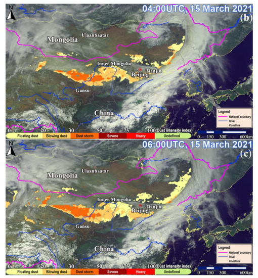 Figure 7 showed that large areas of dust spread over Beijing, Hebei, Tianjin, Inner Mongolia and other areas/regions of northern China. The dust weather had developed into a dust storm in Beijing and northwest of China around 4:00–6:00 15 March. Because China was by day at that time, dust monitoring intensity was able to separate various dust storm levels. In addition, due to the influence of dense cloud belt in front of dusts, we cannot monitor the entire area of dust cover and dust storm.