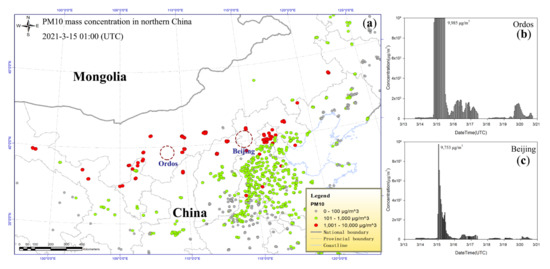 Figure 9 showed that the observed PM10 mass concentration data marked in red in North China is much higher than those from stations marked in green at 1:00 15 March 2021, indicating northern China as the main affected areas of the dust storm. Figure 9b,c showed the variation of PM10 concentration during the dust storm represented by Ordos and Beijing, respectively. The Maximum PM10 concentration at Ordos was 9985 μg/m3 from 20:00 14 March to 10:00 15 March, and that at Beijing it reached 9753 μg/m3 at 01:00 15 March, which was consistent with that observed by the satellite monitoring.