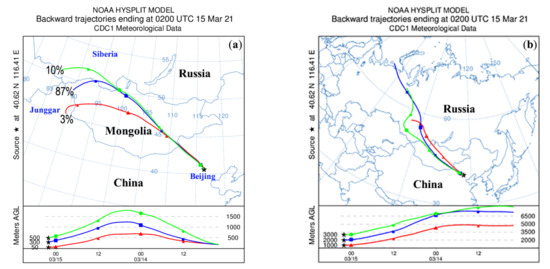 From Figure 10, dusts affecting northern Beijing came from the following three source areas: 87% from northwestern Mongolia, 10% from southern Siberia of Russia, and 3% from Junggar Basin in China. The backward tracking also showed during the long-distance transport, the dust was blown from surface to a height of 500–1800 m, transporting over a long distance in the wind before gradually falling down to the surface. Moreover, air masses from high latitudes such as Russian Xindi island and Ural Mountain drop in height during transport to northern Beijing, leading to a sharp temperature decline accompanied by the dust weather.