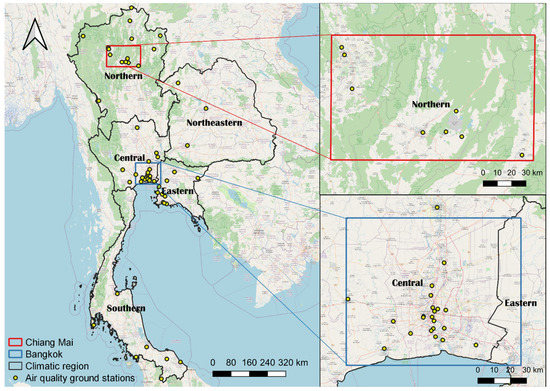 Therefore, countries affected heavily by pollution—such as Thailand which has undergone severe air pollution events due to rapid economic development and urbanization [8]—have developed monitoring systems to address the need for air pollution monitoring and exposure assessments. Three main types of related technology have been normally established. First, the regulatory-grade systems provide the most accurate and robust in-situ observations; nevertheless, they are financially expensive to install and maintain [9]. In order to overcome the consequent low coverage of the aforementioned monitoring stations, low-cost sensors have been deployed in various countries [10,11], of which the quality is still not competitive compared to standard air quality monitoring stations [12]. However, the low cost allows for the deployment of a number of such sensors. Lastly, satellite technology provides broad geographical coverage and consistent data acquisition, hampered only by certain weather conditions [13].