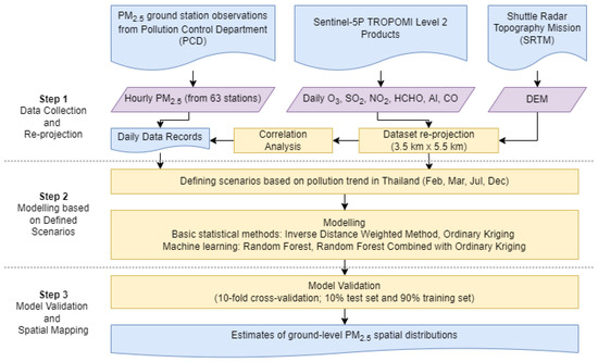 The overall procedure for estimating ground-level PM2.5 is described in Figure 2. The steps consist of (1) data collection and reprojection in order to bring the data sources in the same coordinate system and time window, (2) implementation of spatial interpolation models on defined scenarios, and (3) model validation and mapping of PM2.5 estimates.