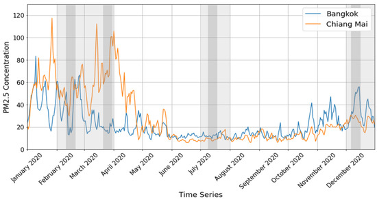 Daily averaged PM2.5 concentrations over Bangkok (blue curve) and Chiang Mai (orange curve) for the year 2020. The light and dark grayed areas correspond to the monthly and 10-day time windows respectively selected in this study as representative of the four unique scenarios for the PM2.5 temporal distribution.
