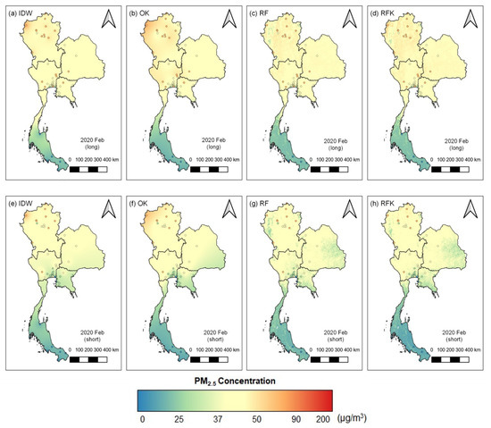 In February, a monthly dataset of which PM2.5 concentration ranged from 11.06 to 86.02 μg/m3, presented high concentration (>50 μg/m3) around Mae Hong Son, and southern regions showed the lowest pollution under 25 μg/m3, which is considered as very good air quality according to the criteria set by PCD. Additionally, the central and northeastern regions were moderately polluted according to Figure 4, demonstrating concentration from 26 to 37 μg/m3, while RF and RFK estimated PM2.5 concentration in northeastern areas over 38 μg/m3. RF and RFK tended to illustrate a spatial variation of PM concentration over the regions, and IDW and OK showed zoning distributions around the monitoring stations. The 10-day dataset, which had minimum and maximum values of 8.21 and 79.69 μg/m3 respectively, also accompanied similar spatial distribution as shown with the 10-day dataset, but with overall lower concentrations.
