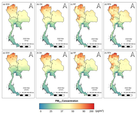 The dataset in March showed drastic concentration variability over Thailand, by having maximum and minimum values of 12.13 and 193.54 μg/m3 respectively. Similar to the results in February, the southern region indicated the best air quality, quantified at under 25 μg/m3, and northern regions were represented as hotspots of pollution, while their coverage became enlarged. The zoning distribution of IDW became excessive, and OK showed an oversimplified gradual increase toward the north. RF and RFK showed detailed spatial variation along with extreme hotspots in the southern and northern areas. Moreover, the pollution that occurred in the northeastern part of the country, as presented in Figure 5, is depicted with a more realistic representation by RF and RFK. The dataset for 10 days displayed a similar pattern to that of the monthly dataset, while the data ranges from 10.90 to 214.05 μg/m3.