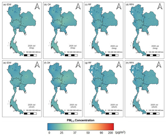The dataset in July produced a rather uniform distribution among the predefined scenarios, which can be attributed to the small variance of the data ranging from 3.65 to 21.64 μg/m3. The pollution pattern is stable as the country enters the monsoon season, which resulted in a uniform color map, and the eastern and central regions showed relatively higher concentrations of PM2.5 than other regions. The dataset for 10 days ranged from 3.55 μg/m3 to 21.62 μg/m3, with a similar distribution for the monthly intervals. The missing data in the TROPOMI atmospheric products resulted in a few blank spaces in the interpolated maps produced from the RF and RFK model, which incorporated satellite images as covariates.