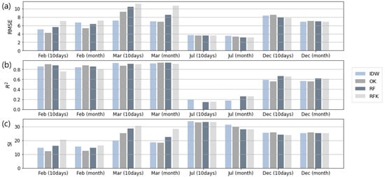 Ten-fold cross-validation results of (a) RMSE, (b) R2, and (c) SI from different spatial interpolation methods for each scenario.