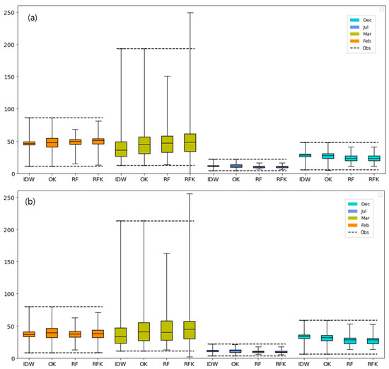 Box plots of data distribution of observations and estimates from four models with (a) monthly and (b) 10-day datasets. IDW, OK, RF, and RFK indicates inverse distance weighted, ordinary kriging, random forest, and random forest blended with ordinary kriging, respectively.