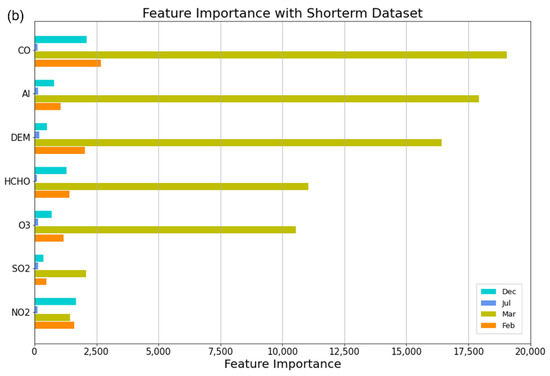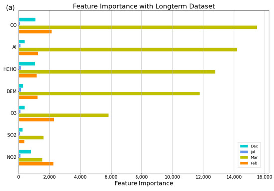 Since the RF and RFK are primarily based on the RF model, we derived significant features used for the models as shown in Figure 10. The importance is represented by the value of the mean decrease in MSE, which indicates the total decrease in model performance when each variable is neglected from the model. According to the results, during the most polluted period in March, overall feature importance was very high compared to other scenarios, with CO, AI, and HCHO being the most important factors to estimate PM2.5 with the monthly dataset, whereas DEM surpassed HCHO with the 10-day dataset. SO2 and NO2 were the least influential throughout the scenarios for both datasets. In February, CO, O3, and NO2 were influential parameters for a month, whereas CO, DEM, and NO2 became more significant for the 10-day dataset. The feature importance in July and December indicated that most covariates were insignificant for the RF model. These results matched the correlation of covariates with PM2.5 overall except NO2 being one of the influential parameters in March. In comparison with the results in Table 2, Figure 10 demonstrates that highly correlated parameters tend to be essential factors for the RF model.