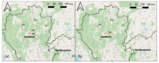 Location of stations used in station-based comparison with the dataset (a) in March and (b) in February.