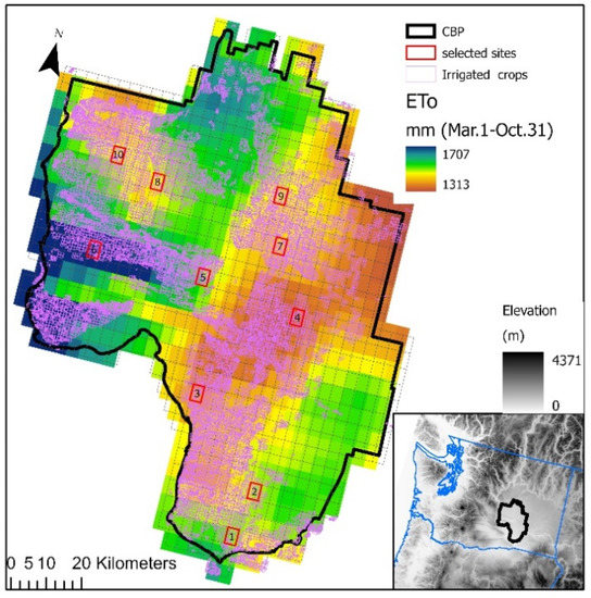 The CBP region has a semiarid climate characterized by cool, moist winters and hot, dry summers (BSk–Köeppen climate classification). Soil composition varies widely from deep, fine soils with moderately low clay content to shallow, sandy wind-deposited soils. The region has ~268,400 irrigated hectares and center pivot systems are the dominant irrigation type (~80% of the total irrigated area). Five crops represent ~60% of the total irrigated extent: alfalfa (hay), grain corn, dry bean, potato, and spring wheat [23]. Ten irrigated grids (4 km × 4 km) distributed in the project area, encompassing the range of regional growing season ETo, were selected (Figure 1).