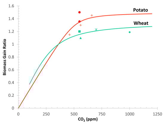 Biomass gain ratio as a function of atmospheric CO2 concentration relative to CO2 of 360 ppm to potato and wheat. FACE data for potato are from Miglietta et al. [43] and Bindi et al. [44] while FACE data for wheat are from Long et al. [38]; Kimball et al., [40]; Ziskas and Bunce [45] and Reuveni and Bugbee [46].