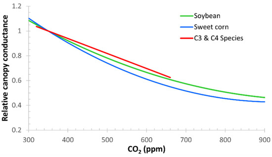 Relative canopy conductance under different atmospheric CO2 concentrations for soybean and sweet corn from Allen et al. [48], and a general response for C3 and C4 species (linear in the range 330 to 660 ppm) from Morison [47].