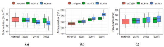 Projected change of (a) solar radiation (MJ m−2), (b) mean air temperature (°C), and (c) precipitation (mm) based on the 15 GCM ensemble for the alfalfa growing season in the study area.