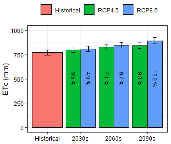 Historical and projected average total reference crop evapotranspiration (ETo) for the potato fixed cycle length. Percent numbers correspond to change with respect to the historical period.