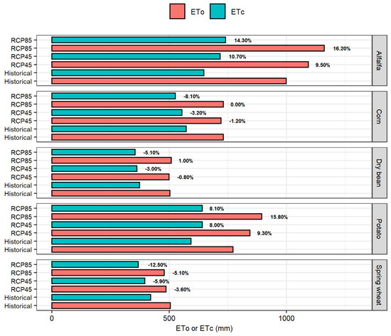 Figure 6 presents ETo and ETc accumulation for the cycle length of five crops for the historical and 2090s periods. Our result shows ETo is substantially larger than ETc, more so for the crops with the largest cycle lengths, with the highest difference for alfalfa (376 mm for RCP4.5 and 420 mm for RCP8.5). The lowest difference (spring wheat) is still considerable (90 mm for RCP4.5 and 110 mm for RCP8.5). These results highlight the difference between ETo and ETc. ETo reflects changes in climate with evaporation coming from a static hypothetical reference crop with well-watered canopy and soil surfaces, while ETc accounts for a climate similar to ETo, but with evaporation modulated by changes in cycle length, the gradual canopy development and senescence during the growing season, the effect of atmospheric CO2 on plant growth (significant increase in the case of C3 species) and stomatal conductance (decrease for C3 and C4 species), and other factors such as episodes of crop water stress that may occur even under well-watered conditions or as a result of deficit irrigation management. Because the level modulation is different in historical and future conditions, the projected percentage changes in ETo and ETc (Figure 6) are also different.