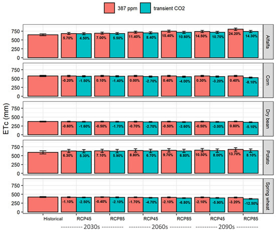 Comparison of future crop evapotranspiration (ETc) under transient CO2 versus constant contemporary CO2 (387 ppm). Results are for a fixed planting date. Percent numbers correspond to ETc change relative to historical values.