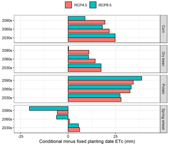 Figure 8 summarizes projected future ETc changes when conditional and fixed planting date scenarios are compared for the four annual crops. Except for some cases with spring wheat, the conditional planting scenario normally causes higher ETc than fixed planting. The magnitude of the increase in ETc by conditional planting depends on the crop: potato > corn > dry bean > spring wheat, the latter switching to lower ETc by midcentury. The position of the growing cycle in the year plays an important role in the ETc differences between the two planting modes. The start of the crop cycle is much earlier with conditional planting: −24 to −25 days (corn), −20 days (dry bean), −27 to −36 (potato), and −36 to −37 days (spring wheat); while the end of the cycle is also earlier, fluctuating from −17 to −41 days for all crops, RCP, and periods, except potato that has a fixed harvest date for both planting modes (Table 4). Despite earlier start and end of cycles under conditional planting, the total length of the cycle for all crops was always larger than under fixed planting mode (Table 4), counteracting the effect of cooler temperatures of the earlier growing season.