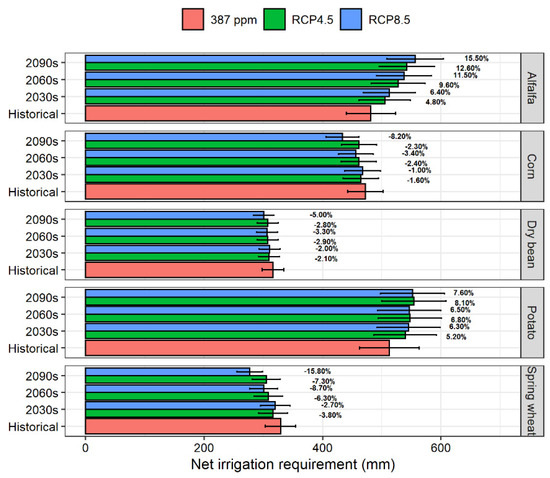 As expected, NIR (Figure 9) for the five crops follows a similar trend as ETc (Figure 6). Our arid study region receives little precipitation in the growing season (Figure 4), with annual precipitation concentrated in the winter and early spring [62], and with irrigation as a significant contributor to ETc. Therefore, the trends in NIR can be expected to closely track that of ETc. Historically, potato, corn, and alfalfa are the largest water users, while spring wheat and dry bean, the lowest. Projecting towards the end of the century, alfalfa and potato will have the largest increase, 12.6–15.5%, and 7.6–8.1%, respectively, while corn, dry bean, and spring wheat will experience important reductions in their irrigation requirements. All these outcomes are mainly related to changes in the cycle lengths (Table 4), elevated CO2 effects, and a minor contribution from an increase in precipitation. Regions with larger precipitation and with a different annual distribution will see NIR trends that drift away from ETc trends. Regardless, crop mixes and their biophysical responses to climate change and elevated CO2 will require careful consideration when projecting changes in NIR.