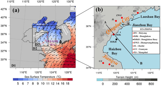 Location of the Shandong Peninsula, geographic map of the Yellow Sea, and three nested domains (D1, D2, and D3) used for numerical simulations (a). Distributions of sea surface temperature (color shades) and 10-m wind field (vectors) at 2000 LST (=UTC + 8 h) 1 April 2014 (b). The former is provided daily from North-East Asian Regional Global Ocean Observing System (NEAR-GOOS) dataset, and the latter is derived from the ERA5 reanalysis. Sites of four surface measurement stations (red dot) and one buoy (black dot) are marked.