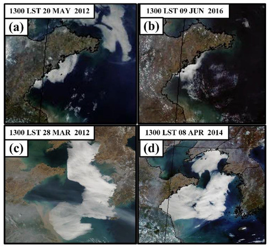 According to the formation mechanism, most sea fogs over the Yellow Sea can be identified as advection sea fogs [7,9]. Under an appropriate synoptic condition, for example, the rear of a high-pressure system [7,11], warm moist air masses are advected from south to north over the cold sea surface of the Yellow Sea, resulting in sea fog formation. Controlled by different weather situations, sea fog formed over the Yellow Sea can greatly differ in the horizontal area covered (hereafter called fog area). Figure 2 demonstrates four typical satellite visible pictures for two kinds of sea fog over the Yellow Sea, one occurring along the coast and the other over the vast part of the Yellow Sea (hereafter termed as coastal sea fog and widespread sea fog, respectively).