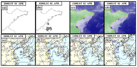 The retrieved sea fog (a,b) and Multifunctional Transport Satellite (MTSAT) visible satellite images (c,d), and Korea Meteorological Administration (KMA) surface synoptic charts (e–h) from 2000 LST 1 April to 1400 LST 2 April 2014.