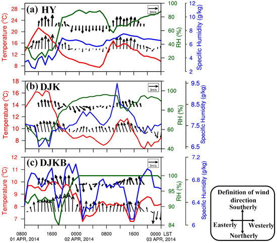 To investigate whether a sea–land breeze phenomenon occurred accompanied by the sea fog process, time series hourly surface measurements at stations DJK, HY, and DJKB (see their sites in Figure 1b) are displayed in Figure 4. This time series included temperature, relative humidity (RH), specific humidity, and wind (thin vectors at the lower part in the panels of Figure 4). For better viewing of the sea–land breeze, the background wind component was removed from the observed wind by a 24-h moving average from 2000 LST 1 April to 2000 LST 2 April. Thus, the left wind component was the sea–land breeze (thick vectors at the upper part in the panels of Figure 4).