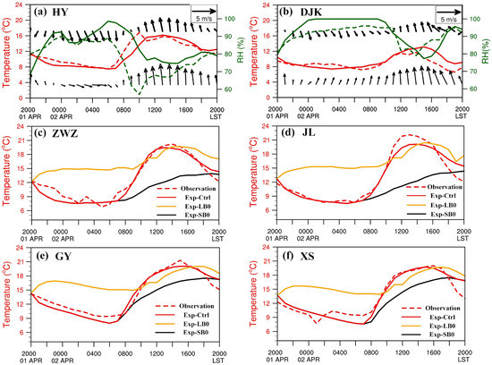 Comparison of the control experiment (solid line) and the observations (dash line) in 2-m temperature, 2-m RH, and 10-m wind. Thick vectors in (a,b) are offshore and onshore winds of the sea–land breezes. The time series of 2m-temperature of Exp-LB0 and Exp-SB0 are given in (c,d). The panels (a–f) are for the stations HY, DJK, ZWZ, JL, GY, and XS, respectively. See the definition of wind direction in Figure 4.