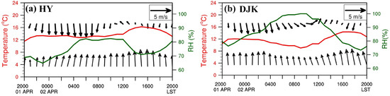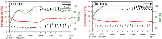 Simulated 2-m temperature (red line), 2-m RH (green line), and 10-m wind (lower vector) of Exp-LB0 at the two stations HY (a) and DJK (b). Upper vectors were 10-m winds in the result of Exp-Ctrl minus Exp-LB0. See the definition of wind direction in Figure 4.