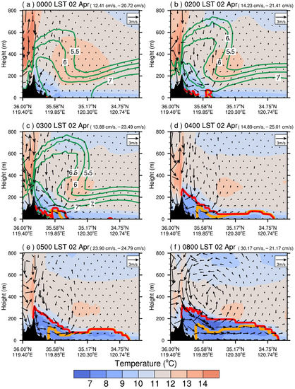 As time went on, the ascending branch gradually appeared, and then the structure of the land-breeze circulation became clearer (Figure 8b–e). Meanwhile, the sea fog started to form (Figure 8b) and grew rapidly (cf. Figure 8c with Figure 8d). On 0800 LST 2 April (Figure 8f), the land breeze circulation was quite complete and clear. For instance, there apparently existed a return flow (anti-land breeze) of 1–2 m/s aloft that brought the cooler air back to land, resulting in faster cooling of the residual layer (see the temperature aloft over land and compare each panel). At the same time, the sea fog’s depth grew up to about 200 m.