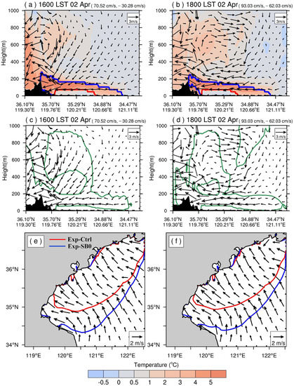 The observational analysis in Section 2.2 has shown that a sea fog case is accompanied by sea–land breezes. However, the Yellow Sea was dominated by a high-pressure system (Figure 3e–h) that led to near southerly winds prevailing over Qingdao coastal waters during 1–2 April (Figure 1a), and this background synoptic flow was almost opposing to the offshore low-level land breeze near Qingdao coast. To isolate the land-breeze circulation, we removed the background synoptic flow off Exp-Ctrl by directly subtracting Exp-LB0.