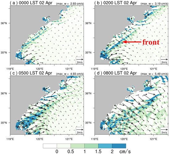 Horizontal expansion of the land breeze circulation that is shown by both 10-m winds (black vectors) and vertical speeds (shades) averaged within 100–600 m from the result of Exp-Ctrl minus Exp-LB0. The information of time and maximum vertical velocity are shown at the top of the panels (a–d).