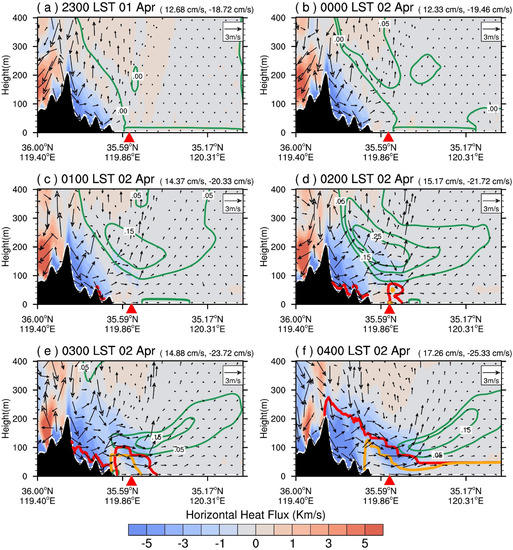 Evolution of horizontal heat flux (color shades) transported by offshore wind and sea fog during the formation stage of the land breeze circulation (vectors) in the vertical cross-section along the line A-B marked in Figure 1. Green contours are the mixing ratio increments of Exp-Ctrl relative to Exp-LB0. Sea fog vertical extents of Exp-Ctrl and Exp-LB0 are outlined by the coarse lines in red and orange colors, respectively. The red triangle indicates the location of vertical profiles in Figure 13. The information of time and maximal vertical velocities are shown at the top of the panels (a–f).
