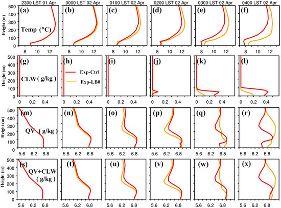Vertical profiles of air temperature (Temp; (a–f)), cloud liquid water (CLW; (g–l)), water vapor (Qv; (m–r)), and the sum of CLW and Qv ((s–x)) from 2300 LST 1 April to 0400 LST 2 April for Exp-Ctrl (red line) and Exp-LB0 (orange line), respectively. The profile location is marked by a red triangle in Figure 12.