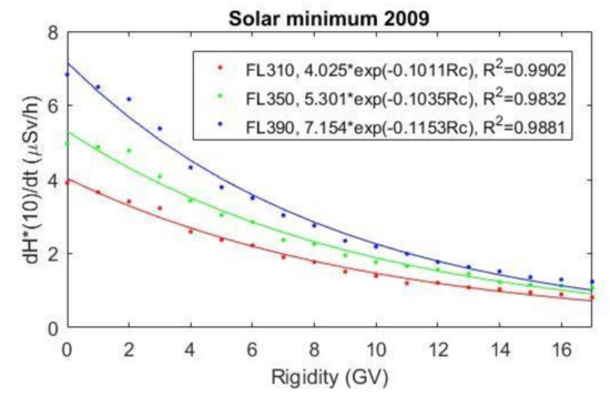 The ambient dose equivalent rate has been calculated as a function of the cut-off rigidity threshold for 2009 and 2014 and is presented in Figure 4. Furthermore, the simulation results are fitted with an exponential curve. According to the results of Figure 4, the fitted curves have high accuracy as the parameter of R2 is above 0.97 in all cases.