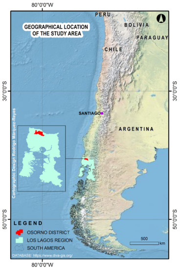 The city of Osorno is an urban city that had a population of 161460 in 2017 [1]; it is located 938 km south of Santiago, the capital of Chile. It is situated in the northern part of the Los Lagos Region in a fluvial valley defined by the confluence of the Rahue and Damas rivers. The city has an area of 32.07 km2 (3207 hectares, ha), equivalent to 3.4% of the total area of the commune of the same name (Figure 1). In recent years, particulate matter (PM) air pollution has become a serious problem in southern Chile, including Osorno, especially during the fall and winter seasons (April–September) [2]. For example, in 2014, for 169 days—nearly half of the days of the year—the PM2.5 (particulate matter of less than 2.5 µm) 24 h World Health Organization Guidelines (WHOG) of 15 µg/m3 were exceeded [3], showing how poor the air quality was throughout the year. This air pollution is said to affect citizens’ health, and in 2019, approximately 5810 deaths were attributable to PM2.5 in Chile [4].