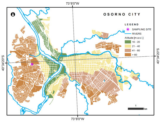 Aerosol samples were collected at the experimental monitoring station Emprender-ULagos, located at Colegio Emprender, Osorno (Figure 2 purple spot; latitude: 40°34′25″ S, longitude: 73°9′54″ W, altitude: 95 m) during April 2019–August 2019. Osorno city has an average altitude of 46.7 m above sea level (m.a.s.l.). It has a flat system of river terraces of 941.82 ha, with altitudes between 10 and 40 m.a.s.l., representing 64% of the inhabited and built surface of the urban system. Osorno is also characterized by a steep hill system towards the west, north, and southwest, with altitudes between 40 and 100 m.a.s.l.—equivalent to 527.84 ha—representing the remaining 36% of the built urban area. This detailed set of urban topographic characteristics constitutes an important factor for the circulation of winds within the city, and there is an approximately 73 m difference between the lowest and the highest points of the city.
