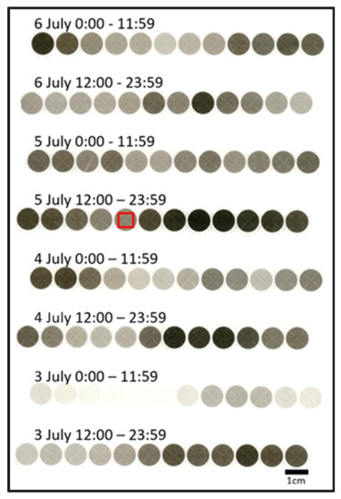 An example of the filter samples used for the Image J analysis. The red square shows how the samples were measured and all the times are indicated in Chilean standard local time (CLT).