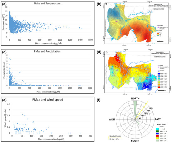 Figure 5c shows the relationship between PM2.5 concentration and precipitation. The PM2.5 concentrations tended to be lower during precipitation events; this may be explained by the wash-out effect of the rain droplets [33]. In addition, it has been reported that a high concentration of PM2.5 is associated with changes in the vertical structure of clouds, which reduces the occurrence of local-scale precipitation [34,35,36,37], leading to less precipitation. The relationship between air pollution and precipitation is complex. Therefore, the obtained data should be considered one aspect of the PM2.5 concentration and precipitation relationship.