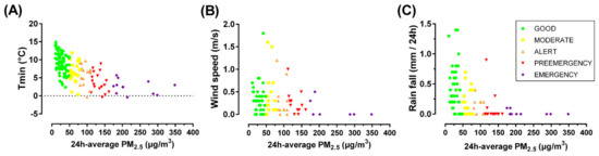 Relationships between PM2.5, colored according to the Chilean air quality indexes defined by the Ministry of Environment, and meteorological factors. (A) the lowest (minimum) temperature of the day, (B) daily average wind speed, and (C) rain fall in 24 h.