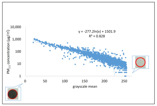 In Figure 7, the PM2.5 concentrations increase exponentially as the grayscale values decrease. This figure shows the grayscale analysis results. A lower grayscale mean value indicates a darker filter color, and a higher grayscale mean value indicates a lighter filter color. A smaller grayscale mean value indicates lots of darker PM, suspected to be soot or rich in black carbon-containing pollutants, in the filter.