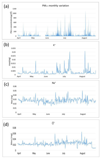 April 2019 to August 2019 (part of autumn–winter) monthly variation in (a) PM2.5 concentration, (b) K+ concentration, (c) Na+ concentration, and (d) Cl− concentration.
